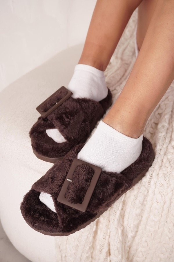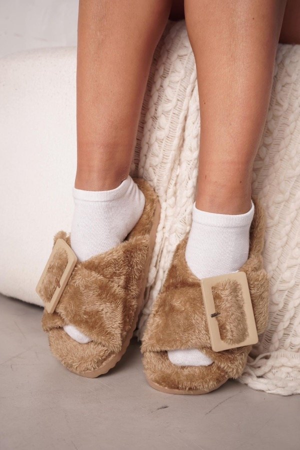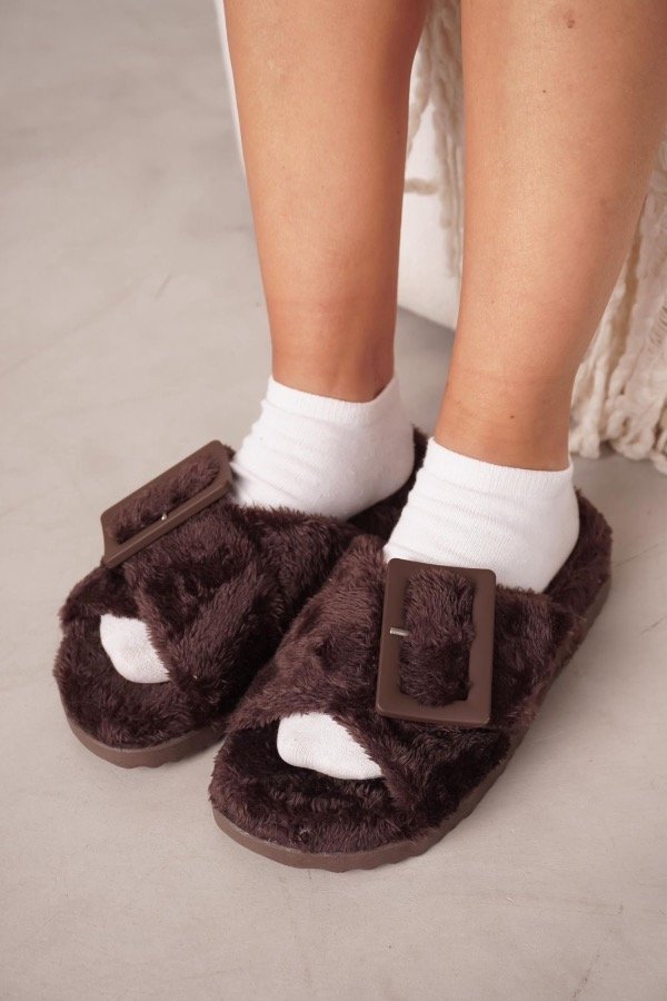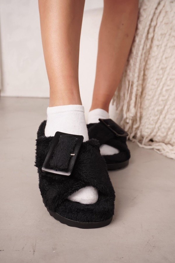 Ojotas de pelo ultra suave con hebilla protagonista que elevan el look sin perder comodidad.